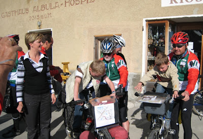 Wir sind etwas früher wach, als an den Vortagen. Ob es an der guten Bergluft, der Vorfreunde auf das Frühstück oder unsere Nacht im 10-Bettzimmer liegt, ist eigentlich gleich. Ein herrlicher Bergmorgen liegt vor uns. Wir stärken uns bei Milchkaffee, Käse, Wurst und Marmelade, ziehen uns ein wenig wärmer an als sonst und verabschieden uns herzlich. Es hat fast den Eindruck, als ob die beiden Söhne unserer Gastwirtsfamilie mitfahren wollen – und dann geht es los. Wir sollen auf die Murmeltiere aufpassen – und tatsächlich sie queren an diesem Morgen unsere Straße jenseits der 2.000 Meter Grenze. Schnell hat uns der hektische Verkehrsalltag im Engadin wieder. Über Pontresina (herzlichen Dank den netten Mitarbeiterinnen im Fremdenverkehrsamt, die uns den gestrigen Post einstellen lassen) geht es hoch zum Bernina. Nicht ganz so schweißtreibend wie der Albula, dafür aber auch nicht ganz so schön. Und dann geht es nur noch abwärts. Zuerst bis in das italienische Tirano und dann mit unserer Kondition, als wir in der Sonne des Nachmittags noch einmal 750 Höhenmeter nach „oben“ müssen. Aprica heißt das Skigebiet auf fast 1.200 Meter. Nur ein Kaffee gibt uns die Kraft für die letzte Abfahrt des Tages – hinunter nach Edolo. Dort sind wir wieder geschrumpft. „Locke“ hat uns in Tirano verlassen und fährt mit dem Zug zurück.