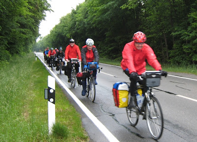 Es ist fast schon so wie immer. Lange vor 6°° Uhr treffen wir uns um Hessenring. Nico schraubt am Fahrrad von Gabriele, Rüdiger zieht seine Regenjacke über, Jörg muss noch mal schnell zum Auto, Walter bringt gegrilltes Tartar vom Vorabend mit (muss ja jemand essen), letzte Abschiedsbilder werden geschossen und dann geht es los. Natürlich regnet es. Bis Stockstadt begleitet uns das kühle Nass „von oben“. Dafür fehlt unser „doc“. Was tun? Weiter fahren? Zu Hause anrufen? Warten? – Da wir von ihm keine Handynummer haben, entscheiden wir uns für „weiter fahren“. Die Entscheidung sollte richtig sein: in Heidelberg sind wir wieder komplett. Dazwischen lag eine schöne Frühstücksrast im Cafe Grimminger in Lorsch (sehr zu empfehlen) und herzlichen Dank an Sponsor Gerhard B.. Nachdem wir uns von Nico und Gerhard E. verabschiedet haben (beide können diesmal nicht dabei sein, geht es weiter Richtung Bergstraße. Ab Viernheim nervt der Verkehr, in Heidelberg die Ampeln, aber dann sind wir doch sehr schnell in Sandhausen bei den „Hundefreunden“, wo wir es uns bei Nudeln und Haschee gut gehen lassen. Es geht richtig schnell voran. Bis Münzeheim. Bei Kilometer 127 hat Peter den ersten Platten. Eigentlich sind es nur noch 35 Kilometer bis zum Hotel, als uns gegen 14.45 Uhr das Missgeschick trifft. Aber es kommt schlimmer: in Bretten fahren wir dem Fahrradwegweiser nach – und laden in einem nicht ausgebauten Neubaugebiet. Jochen hat einen Platten. Ein wenig später müssen wir sein Hinterrad erneut ausbauen. Die Hügel des Kraichgau kosten Kraft und Zeit. Jochen B. vergisst seinen Rucksack beim Nachmittagskaffee seinen Rucksack. Pforzheim findet sich sein Hinweis auf den Ortsteil Sonnenberg – und so wird es 19.45 Uhr, bis wir bei unserem Hotel ankommen. Dafür entschädigt uns eine warme Dusche und ein Zwiebelrostbraten. Auch die Markklöschensuppe mundet. Die Nudeln sind ein wenig „neutral“, dagegen mundet das Schwarzwaldbecher. Die Zimmer sind einfach, aber zweckmäßig – nur der Aufschlag für die Trikot- und Hosenwäsche irritiert. Dafür wird man – trotz aller Freundlichkeit des Chefs – kein Radlerhotel.
