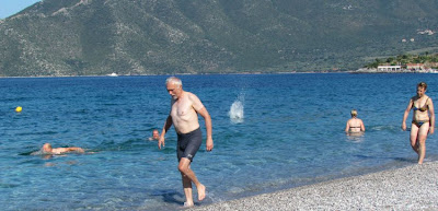 Vorderrad raus, Schlauch gewechselt, Vorderrad rein, Bremse nachgestellt – und los ging es. Aber es ging nur zehn Kilometer gut. „Carmens Vorderrad ist platt“. Nochmal die gleiche Prozedur. Josef, Joachim, Stephan und Jochen F. machten sich erneut an die Arbeit. Um es vorweg zu nehmen: diesmal hielt der Schlauch die Luft und Dietrich musste sich keine Gedanken machen, als Plattenkönig abgelöst zu werden. Dafür, dass die Gruppe zwei Mal eine ungeplante Pause einlegen musste, geht die erste Runde heute Abend auf Carmen. So haben Platten auch noch etwas Gutes. Ach ja – auch zu Dietrich gibt es natürlich eine aktuelle Materialmeldung. Er hat heute einen Totaldefekt an seiner rechten Sandale. Wer unseren Blog regelmäßig liest, wird sich erinnern: die waren extra nach Patras eingeflogen worden. Wir aber wollten nur noch in unser Hotel. Sogar der nachmittägliche Kaffee wurde nur unter teilweisem Widerspruch möglich – denn die Euroradler wollten an diesem Nachmittag an der Ägäis nur eines: die Radlerhose mit der Badehose tauschen.