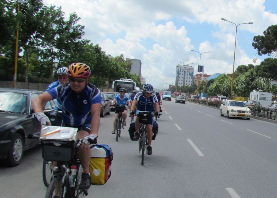 Möglichst genau sollen bei Radtouren die Kilometer geplant werden. Zehn Kilometer mehr am Abend gefallen keinem Radler. Bei den Touren der Euroradler gelingt diese Planung immer (oft, meistens). In Albanien ist dies aber anders. Von Shkoder nach Tirana sind es nach elektronischem Navigationssystem für Radfahrer 140 Kilometer. Per Hand, nach einer albanischen Karte 115 Kilometer und nach dem freundlichen Hinweis unseres Hoteliers in Shkoder „weniger als hundert“. Er sollte Recht behalten: nach Tacho waren es am Freitag genau 94,6 Kilometer. Aber diese hatten es wieder einmal in sich. Diesmal waren es nicht die Berge, sondern der Verkehr zwischen den beiden albanischen Metropolen. Auto an Auto – und jedes hatte ein freundliches Hupen für uns bereit. Bei der Abfahrt aus Shkoder begleitete uns ein ebenso stark bepackter albanischer Radler. Der hatte kein Stevens, kein Koga, weder Shimano noch Ortlieb und erst recht keine Funktionskleidung aus Gore – aber dafür war er genau so schnell wie wir, schickte uns