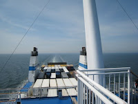 Das geschäftige Treiben im Hafen ließ die Zeit schnell vergehen – und dann bekamen wir den freundlichen Hinweis, dass wir mit den Fahrrädern an Bord fahren können. 9 Personen und 15 Fahrräder – und fahren – nicht laufen – wie kann das gehen? Ganz einfach: zuerst fahren 8 Radler los. Einer bleibt bei den restlichen Fahrrädern. Von den 8, die auf dem Schiff angekommen sind werden sechs mit einem Kleinbus zurück gefahren (zu Fuß gehen ist nämlich nicht erlaubt). Dann kommen die 6 mit den restlichen Rädern (und natürlich mit dem „Wache schiebenden“ restlichen Radler) an Bord. Wir haben diese mathematische Höchstleistung eine Stunde vor Mitternacht ganz alleine vollbracht; ohne Karsten – der war