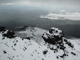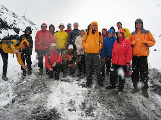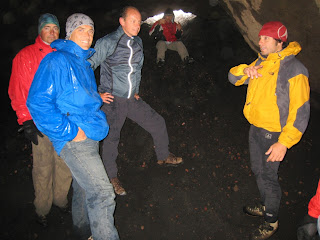 Wer nicht dabei war glaubt es nicht. Der Tag begann für die Euroradler mit viel Regen und Wind. Beim Frühstück immer wieder der bange Blick aus dem Fenster des Rifugio Sapienza. Mit jedem ersten Blick kam etwas mehr Hoffnung auf, mit jedem zweiten Blick schwand sie wieder. Dann ein Anruf von Andrea unserem Bergführer. Das Wetter sei zu schlecht. Die Verantwortung zum Gipfel zu gehen zu groß. Warten. Eine Stunde später kam die Erleichterung. Mit der Seilbahn bis auf 2.500 Meter fahren sei möglich, ein Anstieg auf 2.650 Meter verantwortbar und der Abstieg über den Tunnel und den Krater 2001 ebenfalls. Also legen wir die schwere Bergkleidung an. Stiefel und Winterjacken, Regenhosen und Handschuhe – und dann geht es los. Kaum sind wir aus den Sechser-Gondeln ausgestiegen bläst uns der Wind entgegen. Aus dem Regen ist längst ein dichtes Schneetreiben geworden, aber wir steigen unverdrossen weiter. Der Neuschnee liegt hier schon 15 Zentimeter hoch und darunter feinste Lavaasche. Wir versinken stellenweise knöcheltief, kommen aber gut vorwärts.